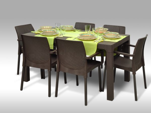 Elegantní zahradní jídelní sestava pro 6 osob sestává ze zahradního stolu Sevilla a šesti plastových židlí Cordoba. Tento zahradní nábytek je vyroben z kvalitního, odolného plastu s dezénem umělého ratanu. Zahradní plastový stůl Sevilla dodáváme v rozloženém stavu, montáž je velmi snadná, stačí jen „zakliknout“ nohy do příslušných otvorů v desce stolu a je hotovo. Tento zahradní stůl vyniká pevnou konstrukcí. Deska stolu je navíc zespodu zpevněna hliníkovými rozpěrami. Plastová zahradní židle s područkami Cordoba je stohovatelná, ušetříte spoustu místa při mimosezónním skladování. Nohy židle jsou vyrobeny z práškově barvené oceli. Židle je vyrobena z kvalitního plastu a vyniká pevnou konstrukcí, díky níž má nosnost 150kg.