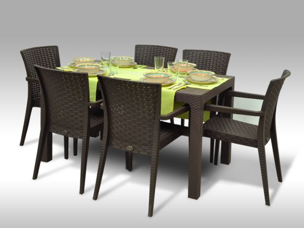 Elegantní zahradní jídelní sestava pro 6 osob sestává ze zahradního stolu Sevilla a šesti plastových židlí Valencia. Tento zahradní nábytek je vyroben z kvalitního, odolného plastu s dezénem umělého ratanu. Zahradní plastový stůl Sevilla dodáváme v rozloženém stavu, montáž je velmi snadná, stačí jen „zakliknout“ nohy do příslušných otvorů v desce stolu a je hotovo. Tento zahradní stůl vyniká pevnou konstrukcí. Deska stolu je navíc zespodu zpevněna hliníkovými rozpěrami. Plastová zahradní židle s opěrkami Valencia je stohovatelná, ušetříte spoustu místa při mimosezónním skladování. Židle je vyrobena z kvalitního plastu a vyniká pevnou konstrukcí, díky níž má nosnost 150kg.