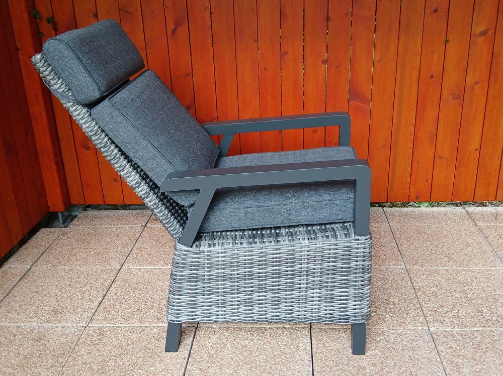 Zahradní nábytek z umělého ratanu - polohovatelné, prostorné zahradní křeslo Preston je luxusní sezení určené k venkovnímu stolování na zahradě, terase či u bazénu. Toto ve všech směrech velké zahradní křeslo jednoznačně patří mezi nejlepší zahradní křesla, jaká jsme kdy měli v nabídce, je totiž neuvěřitelně pohodlné a to i velkým lidem. V boku křesla je navíc zabudovaný systém pro sklápění sedadel podobný zařízení pro sklápění sedadel v letadle. Takže máte-li chuť, můžete si po dobrém obědě opěradlo sklopit tak, jak Vám to vyhovuje, a užít si relaxaci. Obrovskou výhodou je vysoká zádová opěrka s pohodlným polstrováním, které u většiny zahradních křesel nenajdete. Její výška je 64cm od vrchní části podsedákového polstru!