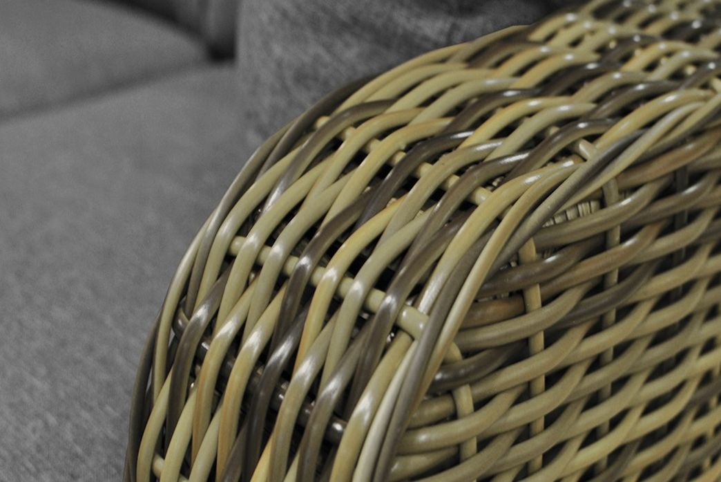 Umělý ratan je vyroben z panenského materiálu, žádný recyklát, proto je jednak barevně odolný i při dlouhodobém působení přímého slunečního svitu, jednak pružný a bez problému zvládá jak vysoké letní teploty, tak i mráz. Výplet je prováděn ručně dostatečně silný umělým ratanem béžové barvy ve světlejších a tmavších odstínech – viz detailní fotografie. Výplet je proveden z moderního kulatého umělého ratanu, což dodává tomuto nábytku luxusní vzhled s efektní patinou.