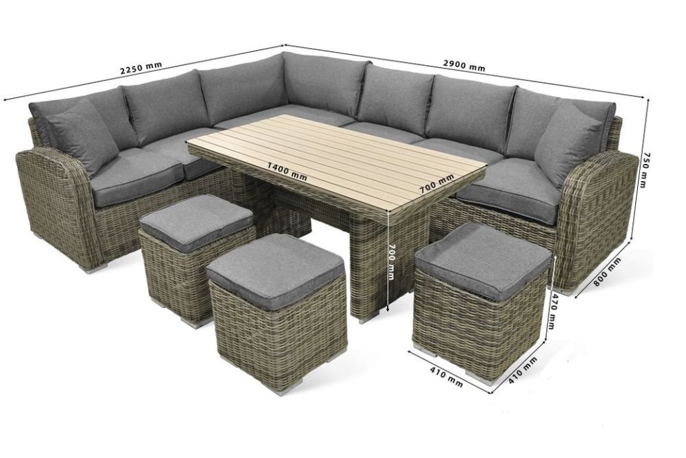 Zahradní nábytek z umělého ratanu - rohová sedací souprava Teresa je pohodlná, luxusní ratanová sedačka určená k odpočinku na zahradě, terase, u bazénu ale i jako hotelový nábytek. Tato sedací souprava z umělého ratanu nabízí pohodlné posezení pro 8 osob. Sedací souprava Teresa má oproti běžným sedacím soupravám z umělého ratanu vyšší stůl, je tedy použitelná jako jídelní sestava! Tento jídelní stůl má povrch z odolného polywoodu = umělé dřevo, které je praktičtější a bezpečnější než sklo.