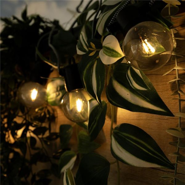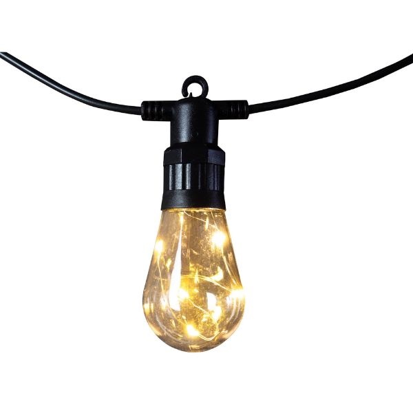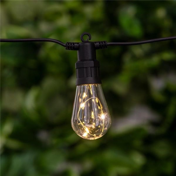 Světelná girlanda se žárovkami o délce 5m + 3m přívodní kabel, určená i pro venkovní použití. Tento venkovní světelný řetěz má 10 integrovaných led žárovek, nemusíte k němu tedy přikupovat žádné světelné zdroje. Designové led žárovky ve tvaru kapky mají uvnitř zkroucený nano led řetěz, který vydává velmi efektní světlo. Svítí teplou, nažloutlou barvou světla, která navozuje klid a pohodu. Tuto girlandu je možné vzájemně propojovat do celkového počtu 3 stejných řetězů, lze tak vytvořit až 15m dlouhý světelný řetěz + 3m přívodní kabel.