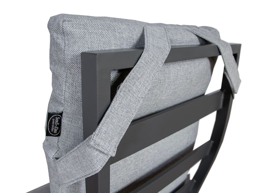 Polstry zahradního křesla, jež jsou součástí balení, jsou potaženy kvalitní tkaninou z olefinu šedé barvy, která je voděodolná a odolává navíc i plísním a slunci. Přesto je na dotyk příjemná a nabízí příjemné posezení i v plavkách. Potah polstrů je ušitý v jednom kuse, aby se při sezení nebo za větrného počasí jednotlivé polštáře nerozjížděly od sebe. V potahu jsou pak 2 samostatné oddíly, každý na zip, v nichž je umístěn příslušný polstr. Výplň polstrů je vyrobena z paměťové pěny. Podsedák má nadstandardní výšku 7cm pro Vaše maximální pohodlí. Zádový polstr je dělený na dvě části, aby co nejlépe kopíroval tvar zádové opěrky, k níž jej upevníte dvěma popruhy na suchý zip, které jej zajistí na svém místě. Potahy jsou snímatelné (mají otvor na zip, kterým vyjmete výplň) a pratelné na 40°C bez aviváže. Nesmí se sušit v sušičce. Samy rychle vyschnou.Díky pořádným polstrům, mírnému sklonu zádové opěrky, který lze podle potřeby nastavit, její nadstandardní výšce a též díky dostatečné šířce a hloubce sedu se v zahradním křesle Marvin sedí tak příjemně, že nebudete chtít vstát. Kdo by nechtěl perfektní polohovatelné zahradní křeslo ve kterém se pohodlně sedí, hezky v měkkém, a které přitom vydrží vlivy počasí a není třeba se o něj starat? Tak to je přesně Marvin – unikátní velké hliníkové polstrované zahradní křeslo, jaké u konkurence jen stěží najdete. A pokud náhodou ano, nedoplatíte se za něj. Díky hliníkové konstrukci je toto zahradní křeslo lehké, snadno se s ním manipuluje.